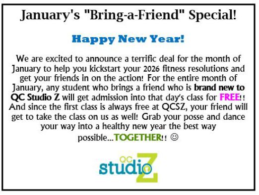 Please note: ALL students will be required to sign a QC Studio Z waiver before attending class. You may either click here to print out/complete the form at home and bring it with you to class OR you can pick one up at our front desk and fill it out there*.